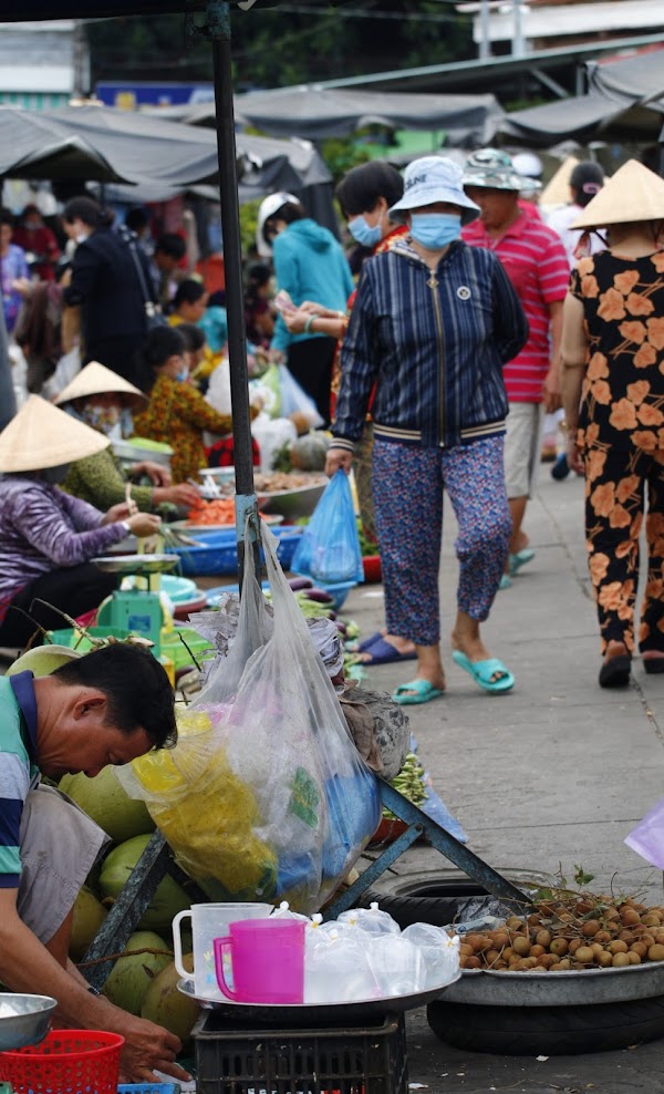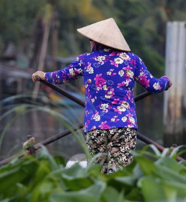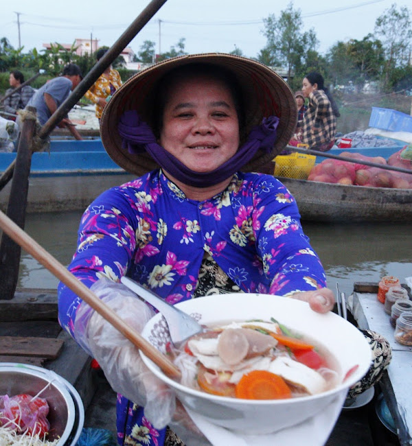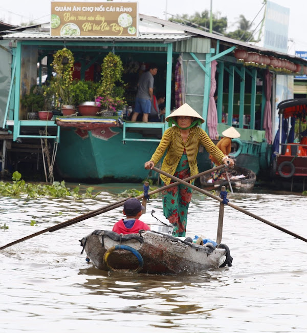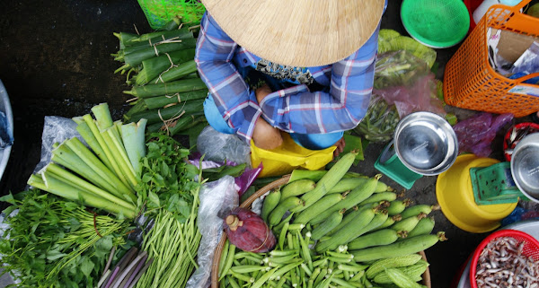 Poco antes de las cinco de la mañana nos pusimos en marcha. En el estómago, un horroroso café soluble con una cucharada de azúcar de un bote conquistado por diminutas hormigas. Aún es noche cerrada. En el cielo solo se aprecian dos o tres estrellas entre la polución del Mekong. Río abajo, el silencio sería absoluto si no fuera por los cientos de miles de insectos que llevan horas con su particular concierto y por el ruido del motor al ralentí de la fueraborda de Martín, el dueño de Ricefield Lodge Delta Mekong, en la que navegamos. A estas horas el Mekong tiene un halo de misterio. Sin hacer ruido, entre la jungla y cruzando el humo que sale de las barbacoas, avanzamos. A ambas riberas, de las casas se trasluce a sus moradores acicalándose para un nuevo día con el brillo de una bombilla. La vida se despereza conforme amanece. Desayunamos en un restaurante improvisado donde se acumulan varias barcas que dan de comer a los trabajadores del delta. Una simpática señora no nos da opción elegir. El menú es único: pho, una sopa típica vietnamita compuesta por fideos de arroz, carne y un sinfin de verduras que se convierte en la primera comida del día. A 30 grados lo que menos apetece es una sopa caliente, pero esta está extremadamente sabrosa. Cada bocado es diferente. Cebollino, tomate, soja, zanahoria y hierbas variadas son algunos de los ingredientes que conseguimos identificar. Siguiendo el curso del río, el día se despereza por completo cuando llegamos al mercado flotante Cai Rang. A estas horas casi hay más turistas que trabajadores. Es interesante saber qué estos puestos tradicionales se pueden convertir en unos años en simples atracciones turísticas, si no lo son ya. El gobierno vietnamita está construyendo puentes y carreteras que están desviando la actividad económica del agua a la tierra, como nos cuenta nuestro guía Martín. Sea como fuere, el sitio es curioso, digno de ver. Calabazas, piñas, plátanos, tomates, cebollas... Hay de todo en los barcos que parecen estar especializados cada uno de ellos en un producto. Hasta aquí vienen las compradoras (la mayoría eran mujeres con sus icónicos gorros de paja) que vuelven a sus casas en sus particulares barcas de madera cargadas y en algunos casos acompañadas de sus hijos pequeños. Conviven con el paso de grandes buques que transportan sobre todo materiales de construcción. Al delta del Mekong vale la pena venir. Hay de todo. Una zona ya turistificada, adónde vamos todos, y otra más "real" saliéndose del habitual circuito turístico donde se ve la vida apacible de los vietnamitas del sur del país dedicados en gran parte a la agricultura como se descubre al alojarte en el complejo de Martín, alejado de cualquier atisbo de turismo. Esto no tiene nada que ver con el estrés que genera el tráfico de las grandes ciudades de Vietnam. Es un halo de paz.