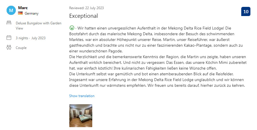 We had an unforgettable stay at Mekong Delta Rice Field Lodge! The boat trip through the scenic Mekong Delta, especially the visit to the floating market, was an absolute highlight of our trip. Martin, our guide, was extremely hospitable and took us not only to a fascinating cocoa plantation but also to a beautiful pagoda.
